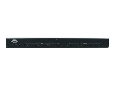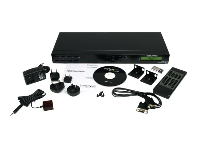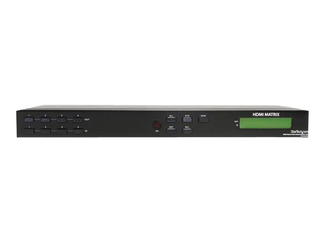 - Information Share and switch four distinct HDMI audio/video signals between four displays. The VS440HDMI 4x4 HDMI Audio/Video Matrix Switch/Splitter (with Audio and RS232) lets you share up to 4 distinct HDMI or DVI inputs (using HDMI to DVI adapters - not included), with audio, between 4 independent displays or projectors. Providing convenient front push-button and RS232 PC software control, this matrix switch allows each input and the corresponding audio to be switched individually, meaning that different A/V sources can be shown on each output, or a single source can be output to several offering maximum flexibility. The switcher features a front panel LCD display for easy status monitoring, plus an included remote control and IR extender module for simple control from a distance. Designed to provide maximum functionality while saving space, the HDMI Video Matrix Switch can be used as a standalone solution or rack-mounted using ear-mounts (included).